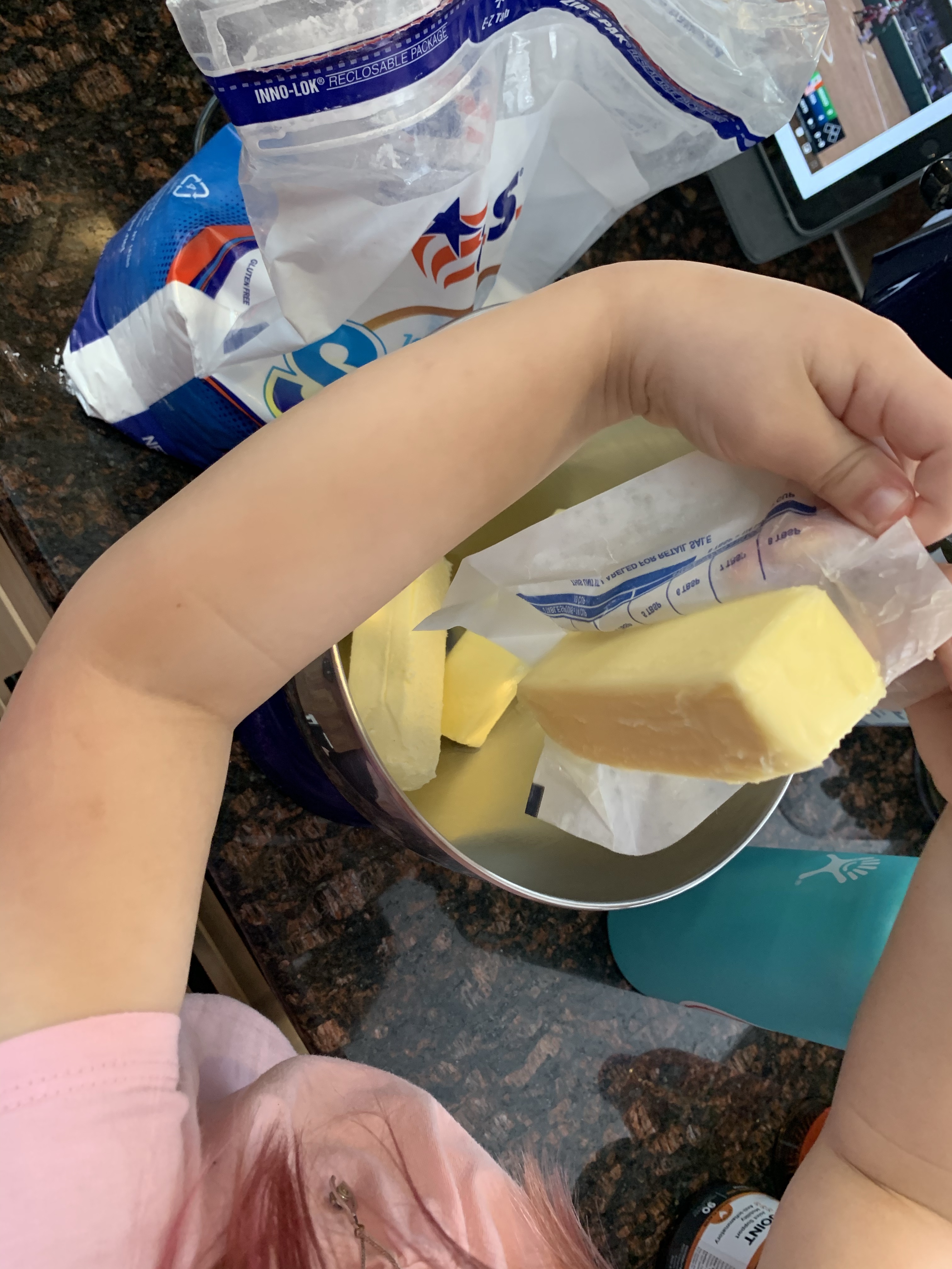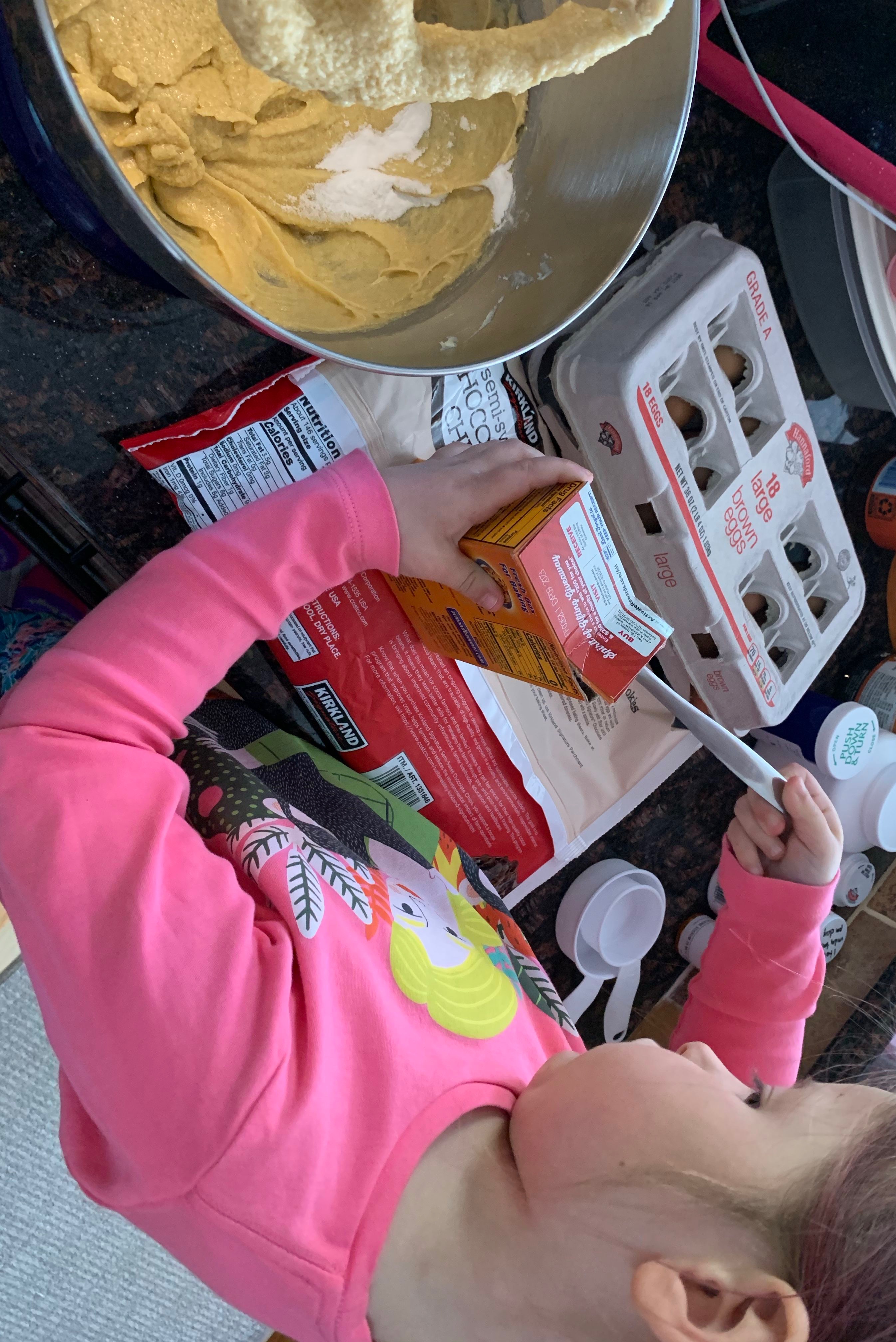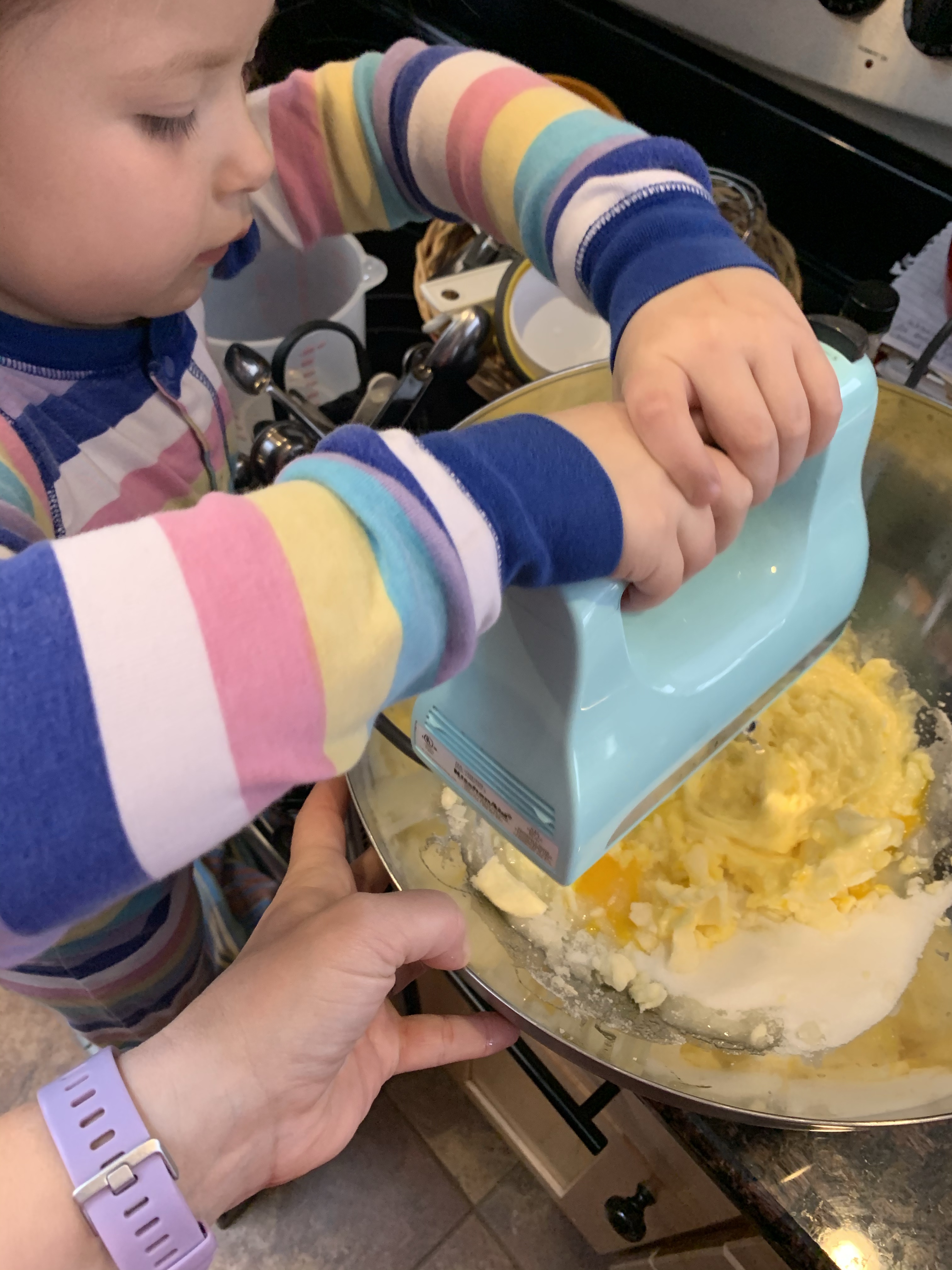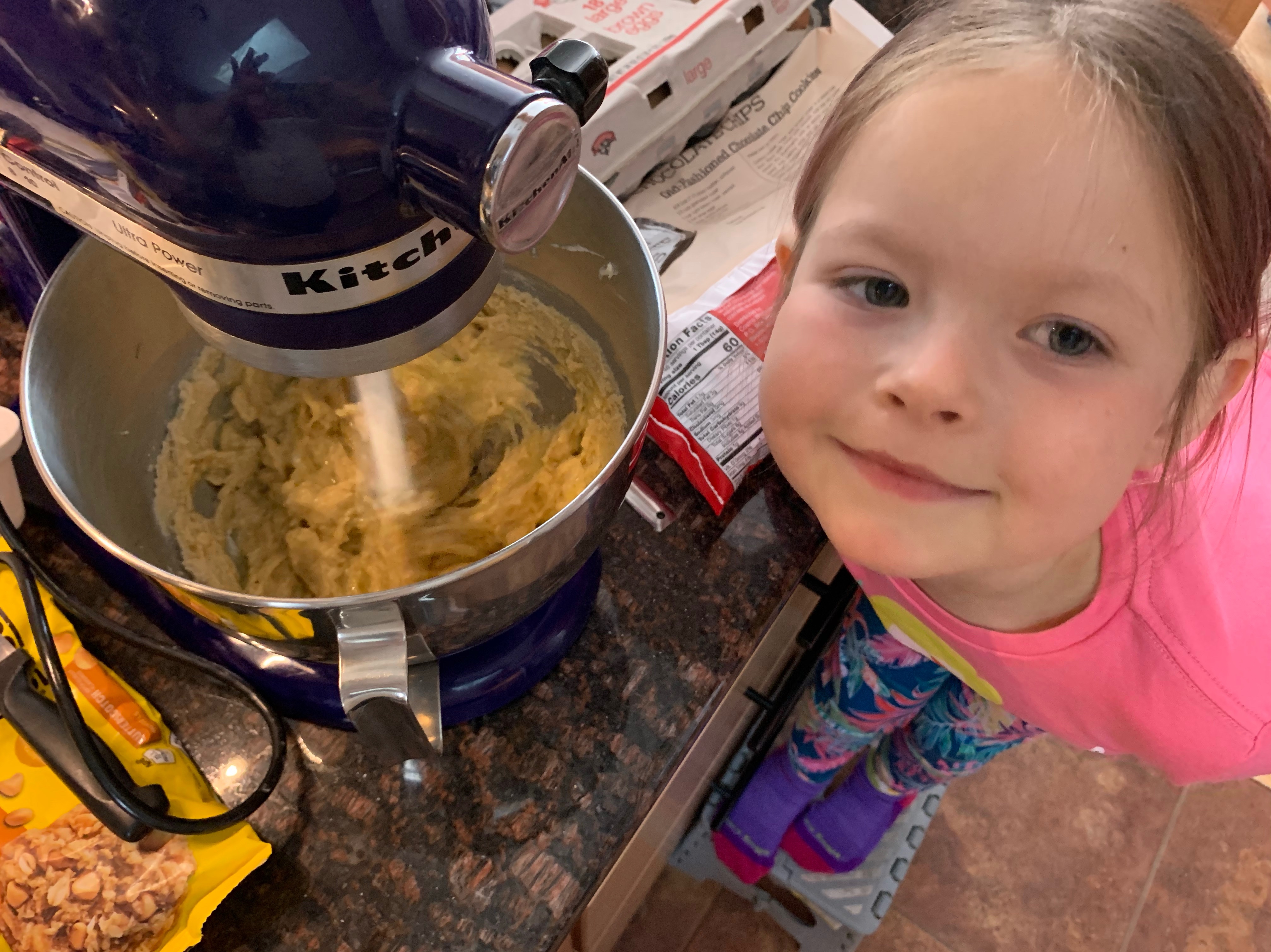 We took our favorite chocolate chip cookie recipe (which is on the back of the Kirkland brand chocolate chips if you can believe it!) and instead of all chocolate chips we did half chocolate and half butterscotch. Again, this was not a difficult or complicated recipe, which is why we were able to do 2 recipes today. The 5 year old worked as hard on these as she did on her choice, but was put off of egg cracking given the serious drama of the previously made batch. (I’m kidding, kind of…she refused to crack the eggs but it was because it was “way too yucky” on her hands. The drama is real with this kid!)