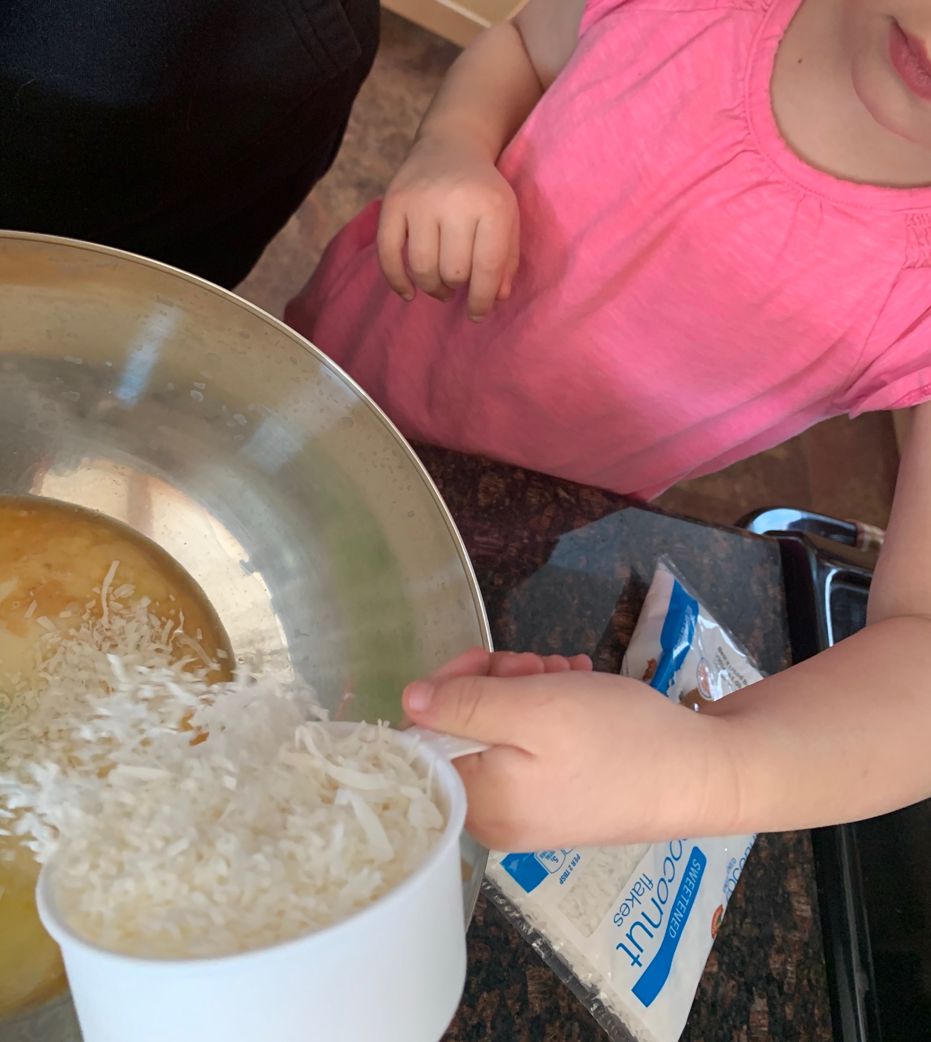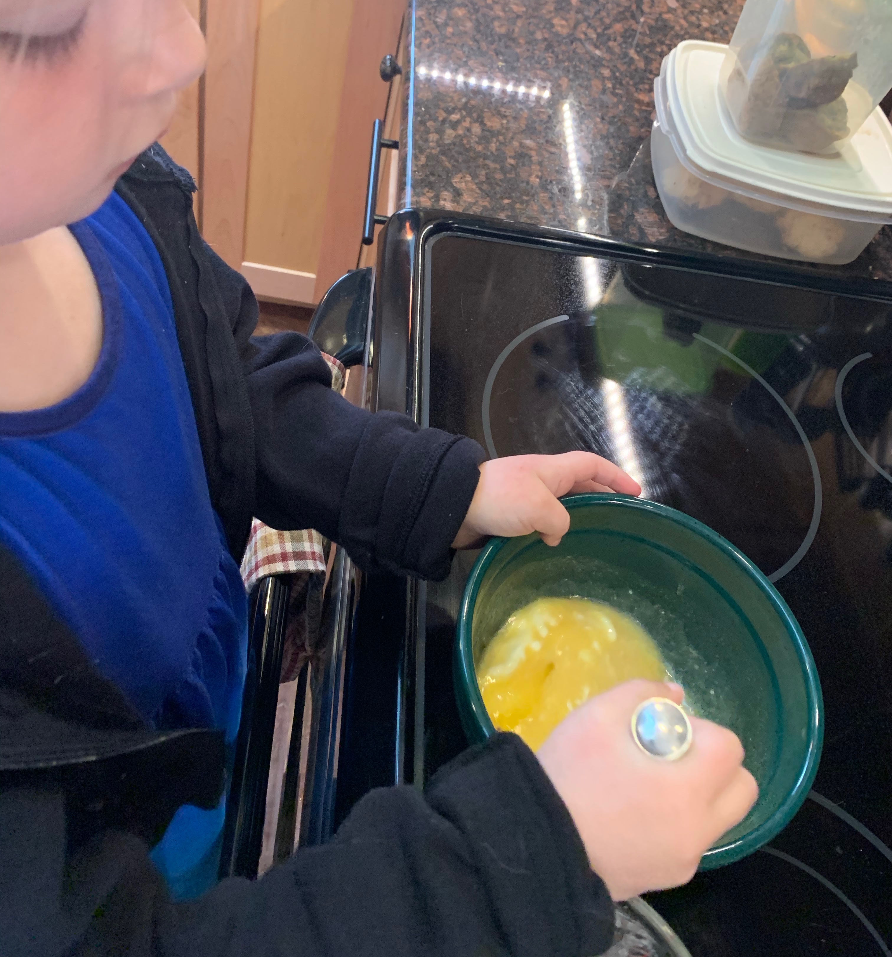 The kids were neat and tidy, I however dropped an egg and got eggshell into the mix while cracking them. I seriously need to get the kids on bored with doing the eggs, I’m sure they’d be better at it then me! Making a mess when we bake is not a big deal for us, we just roll with it, no matter who the mess maker is. I actually think it’s a great for the kids to see me making mistakes and dropping things. It shows them that adults can’t do it all right, which is a FACT around here!