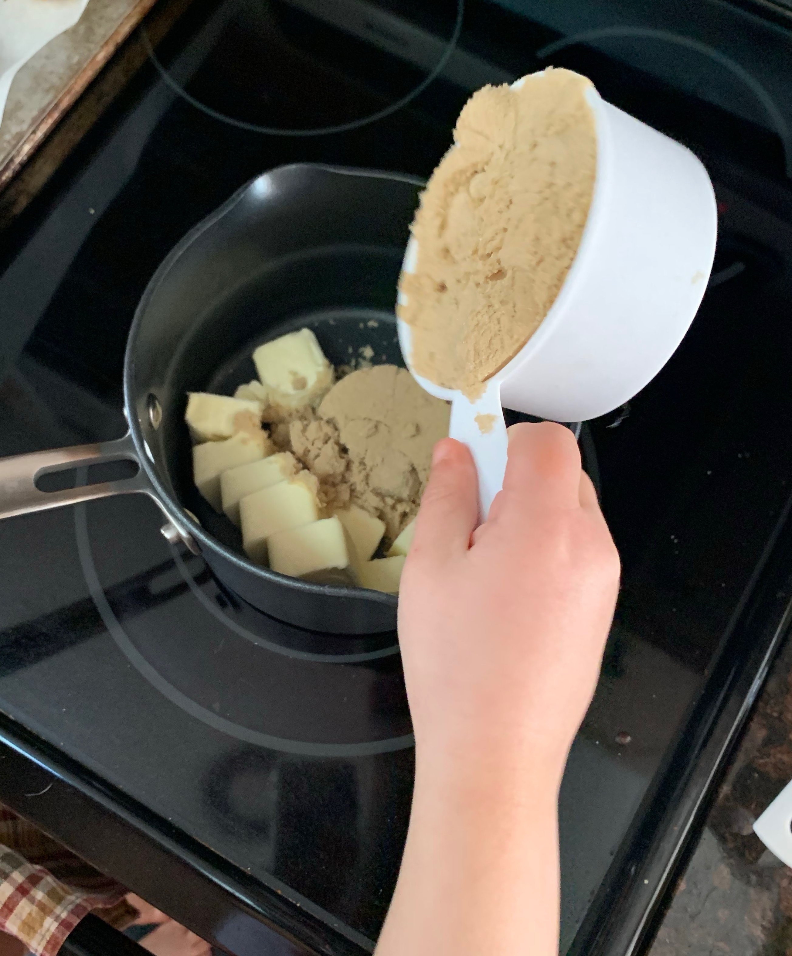 Once those were done we started on the no bake cookies. Since these are made on the stove top and the 5 year old wanted to be in charge I kept a little bit closer eye on things. We measured everything out before, including the peanut butter and the oats, and just set those aside. She kept and eye on the stuff in the pot and stirred it when necessary. She’s had a fair amount of practice at the stove and has been getting more comfortable there recently. If your young baker in inexperienced working on the stove top have them pull up a stool next to you and watch and you talk them through what’s happening. Be sure to focus on safety, such as where it is safe to touch and where it is not. Talk about what happens when you get a burn, and how to handle it when the inevitable happens. Let them build their confidence slowly and before you know it they’ll be confidently working!
