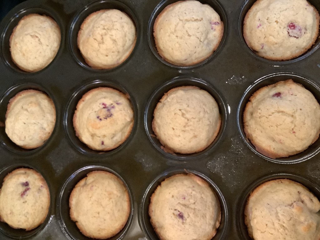 The muffins look great, slightly golden on top, and smell wonderful! We know from experience that they hold up well and I’m sure they’ll be delicious. We’ve used this recipe to add freeze dried fruit (like today), fresh fruit, nuts, dried fruit (cranberries, raisins, etc), and chocolate chips (because CHOCOLATE!). They adapt really well and you can fill them FULL of goodies! Depending on how much you put in (today we added one cup of freeze dried raspberries, in the past I’ve added up to 2 cups of add ins) this recipe will make between 18-24 muffins.
