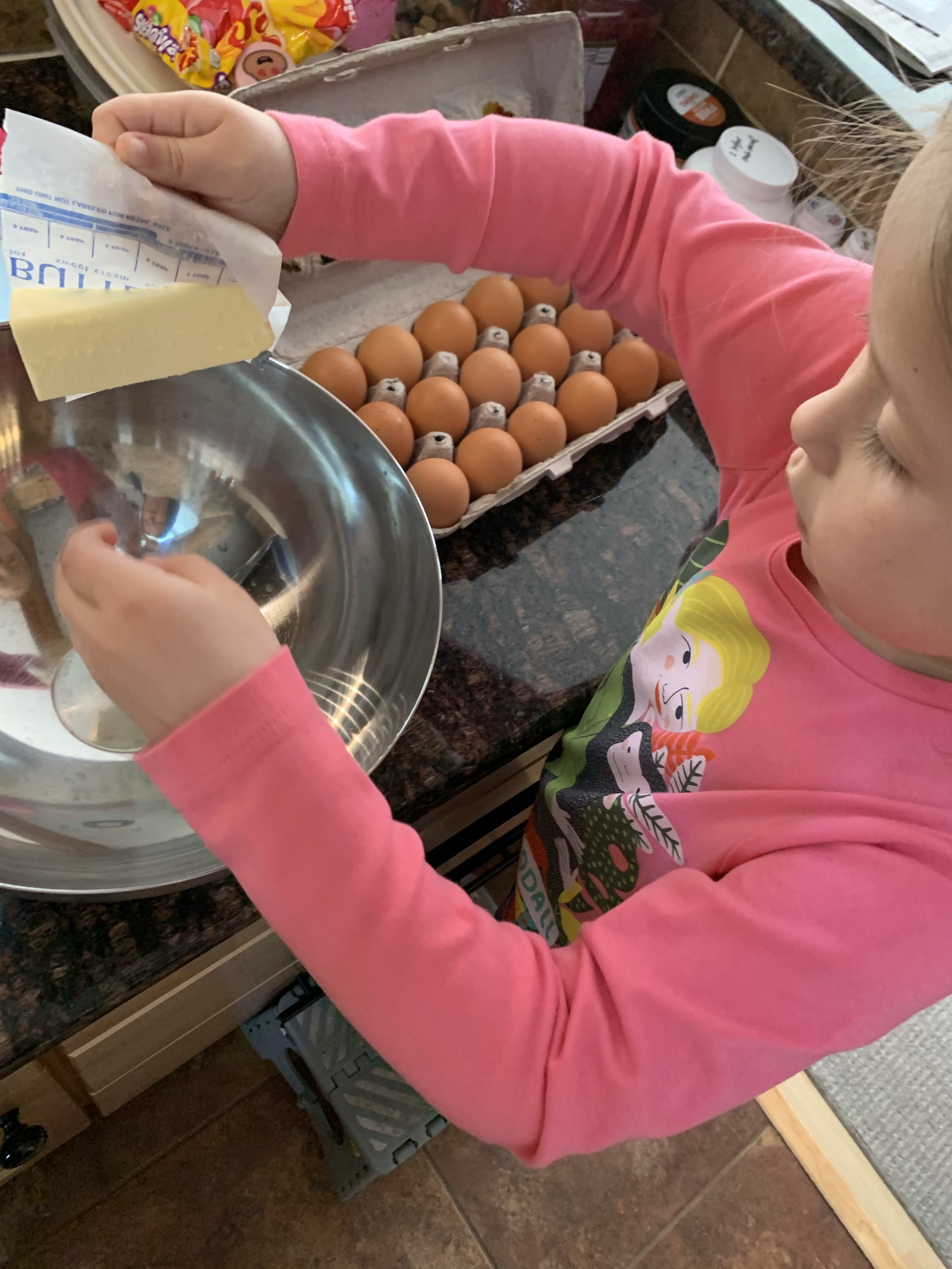 We started by getting out all of our ingredients. This is not a complicated recipe (I’ll share it with you all at the end) but it’s a great basic starter recipe that you can really make into your own and adapt to any mood! While I melted the butter the little measured and mixed all the dry ingredients. Today she was very tidy (not usually the case, but I’ll take it) and barely spilled anything! Maybe making them help clean up is working? She then started with the wet ingredients in a separate bowl and wisked those together. I poured the wet ingredients into the dry and she mixed it all up then helped scoop it into the muffin tins! This was her show! It was so fun to see her 5 year old self working so thoughtfully through this process.