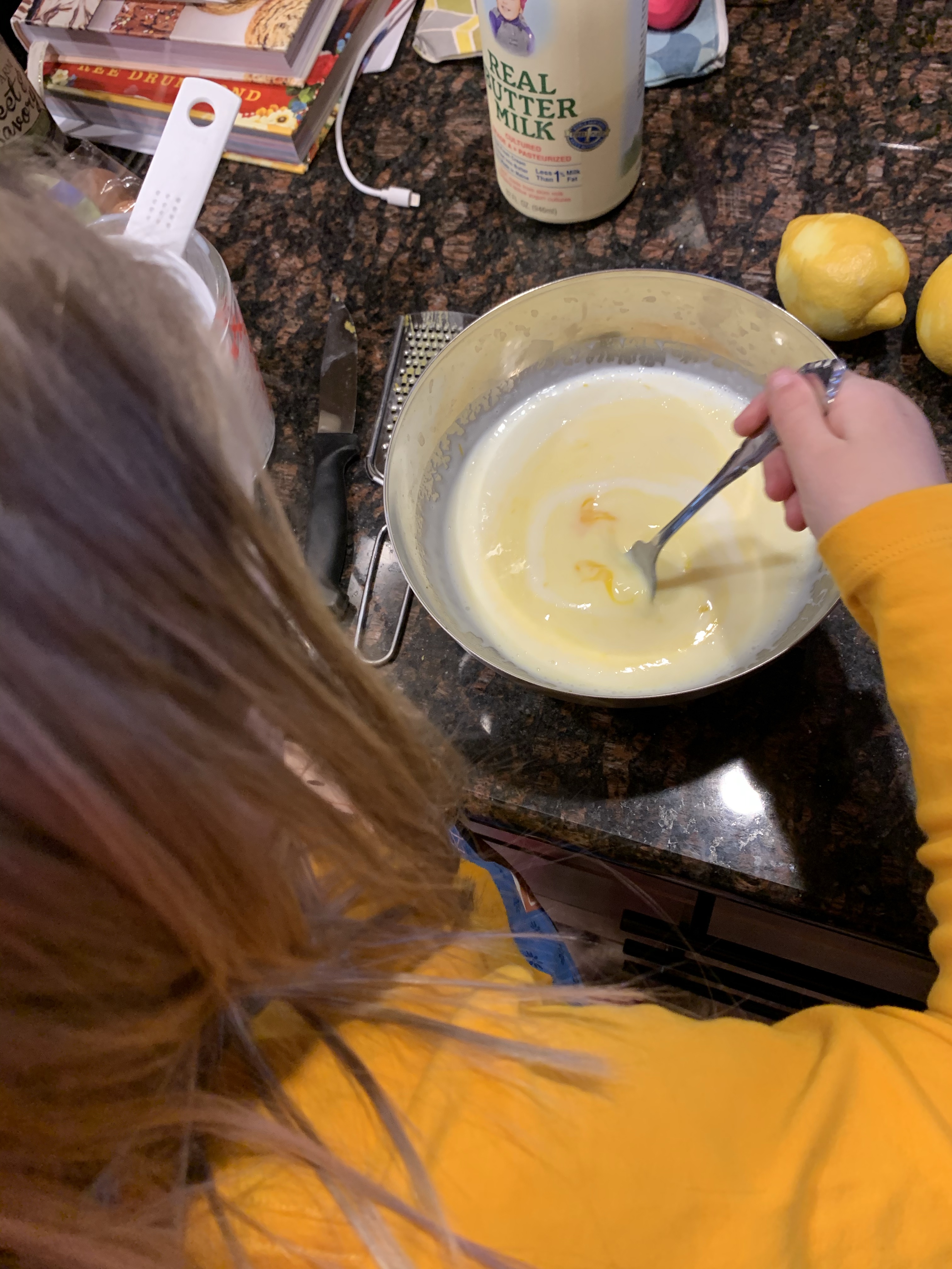 This time the kids were eager to help. The big kids LOVES to zest lemons so she got right on that, and the little is all about the sifter, so she started with the dry ingredients. We made these on a beautiful day so in the interest of time (we wanted to get outside) while they were tackling their jobs I got started with the wet ingredients. Normally they do it all, normally they want me involved as little as possible, but this time they were happy for the help and we had a blast!