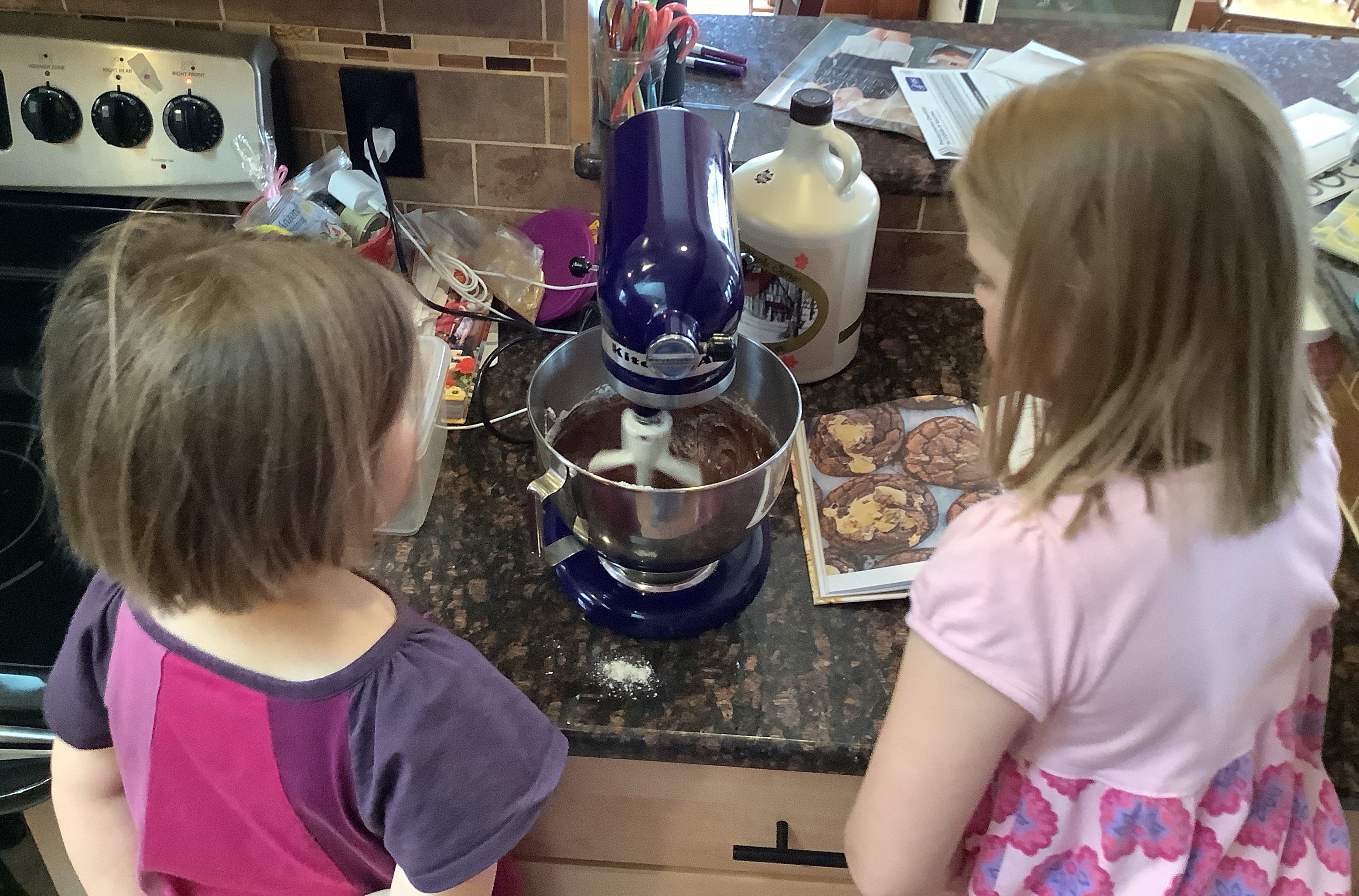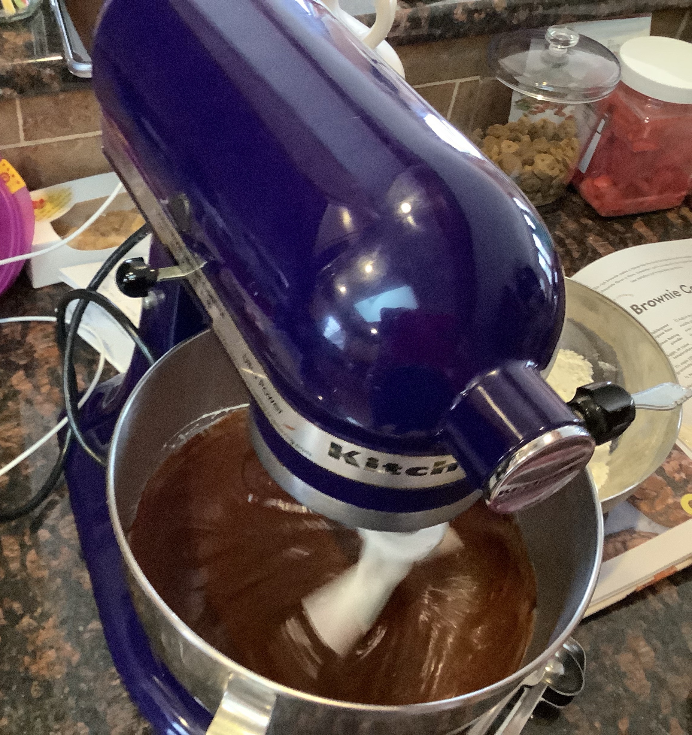 There are several steps in this recipe, but my two little bakers took the lead as usual. They are becoming so comfortable in the kitchen and at following recipes. Every time we bake they need me less and less, except for the eggs, they still won’t do the eggs! I even let them take charge of the part of the recipe that involved melting the butter and chocolate on the stove top. The big kid got it all measured and in the pan, the little kid stood very carefully over the pan and stirred and watched. I did poor it into the stand mixer myself, she thought just to irritate her, but safety first and it was a hot pan with hot liquid so it seemed prudent.
