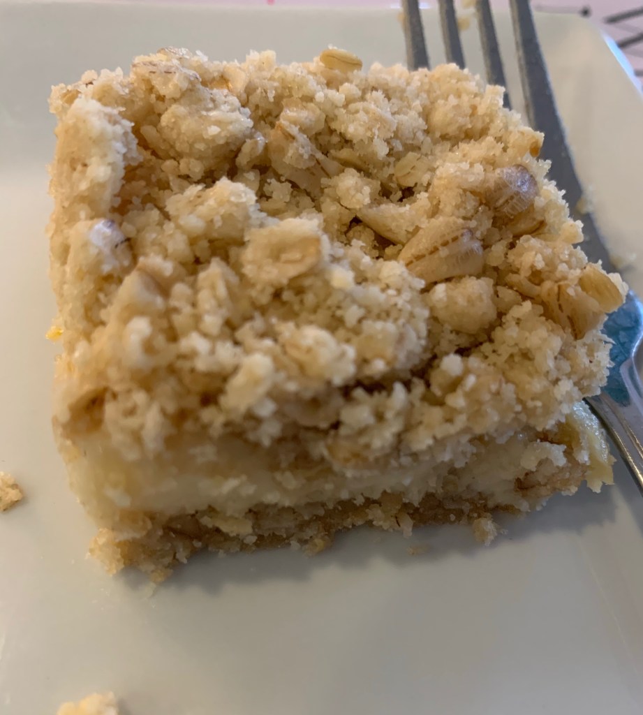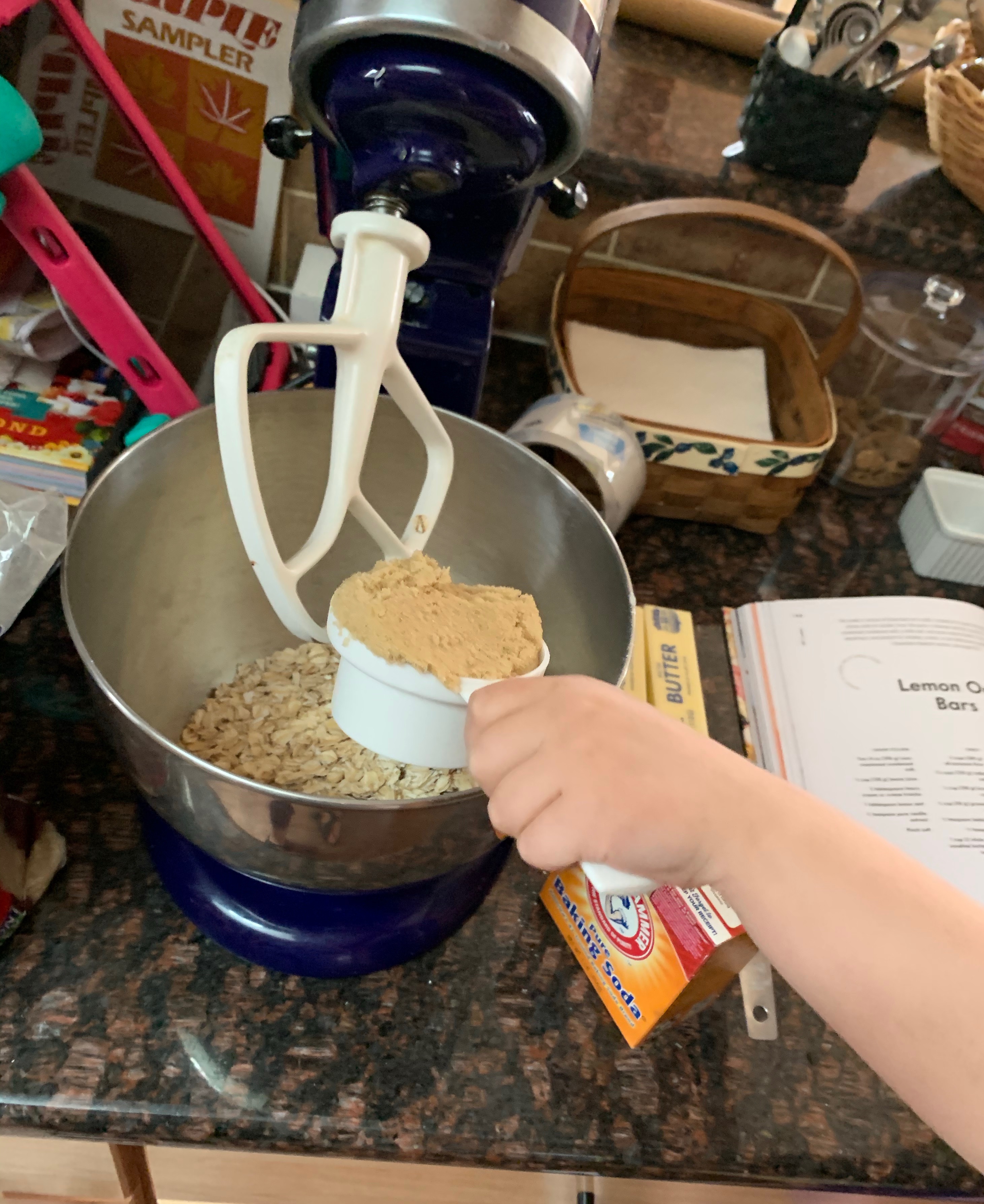 #52, Lemon Oat Bars. Lemon, oats, big spring flavors! I was excited she chose this one as I had been checking it out earlier in the week but never got around to it. We read through the ingredient list together, got it all out, then read through the recipe. I find this helps us all to know what to expect as we move forward with the recipe.
